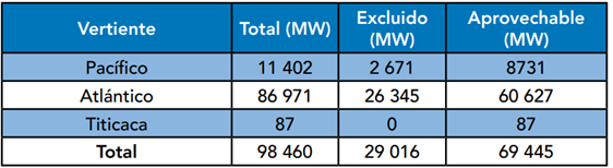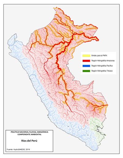 Algunas otras características de la red fluvial amazónica que influyen en el potencial hidroeléctrico son el volumen, desnivel y caída de agua. Cabe mencionar que el potencial hidroenergético del Perú es aproximadamente de 98,460 MW, de los cuales 69,445 MW son aprovechables, mientras que la diferencia se concentra en áreas protegidas y en concesiones eléctricas vigentes[1]. Las cuencas de mayor interés para realizar proyectos hidroenergéticos se encuentran en la vertiente hidrográfica del Atlántico, en las cuencas de Madre de Dios, Inambari, Urubamba, Alto Marañón y Alto Huallaga (ANA, 2016), las cuales son parte del ámbito fluvial amazónico.